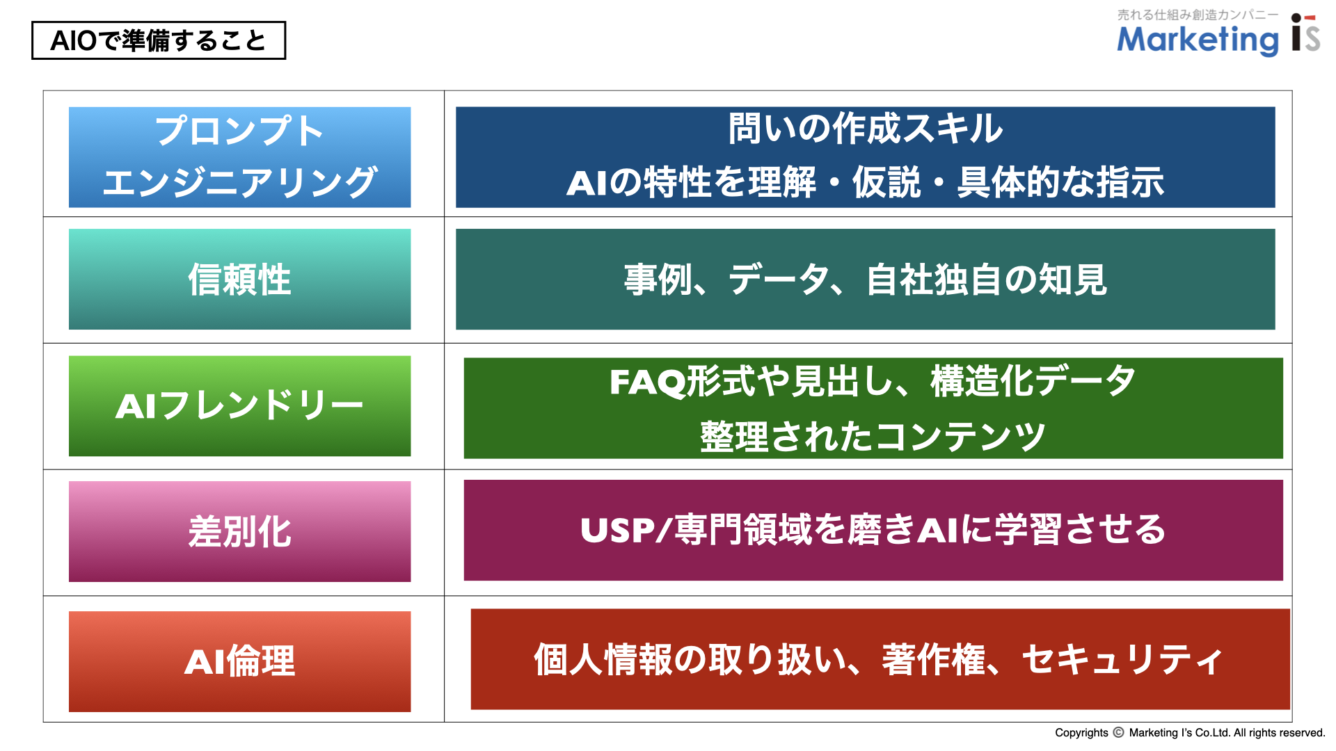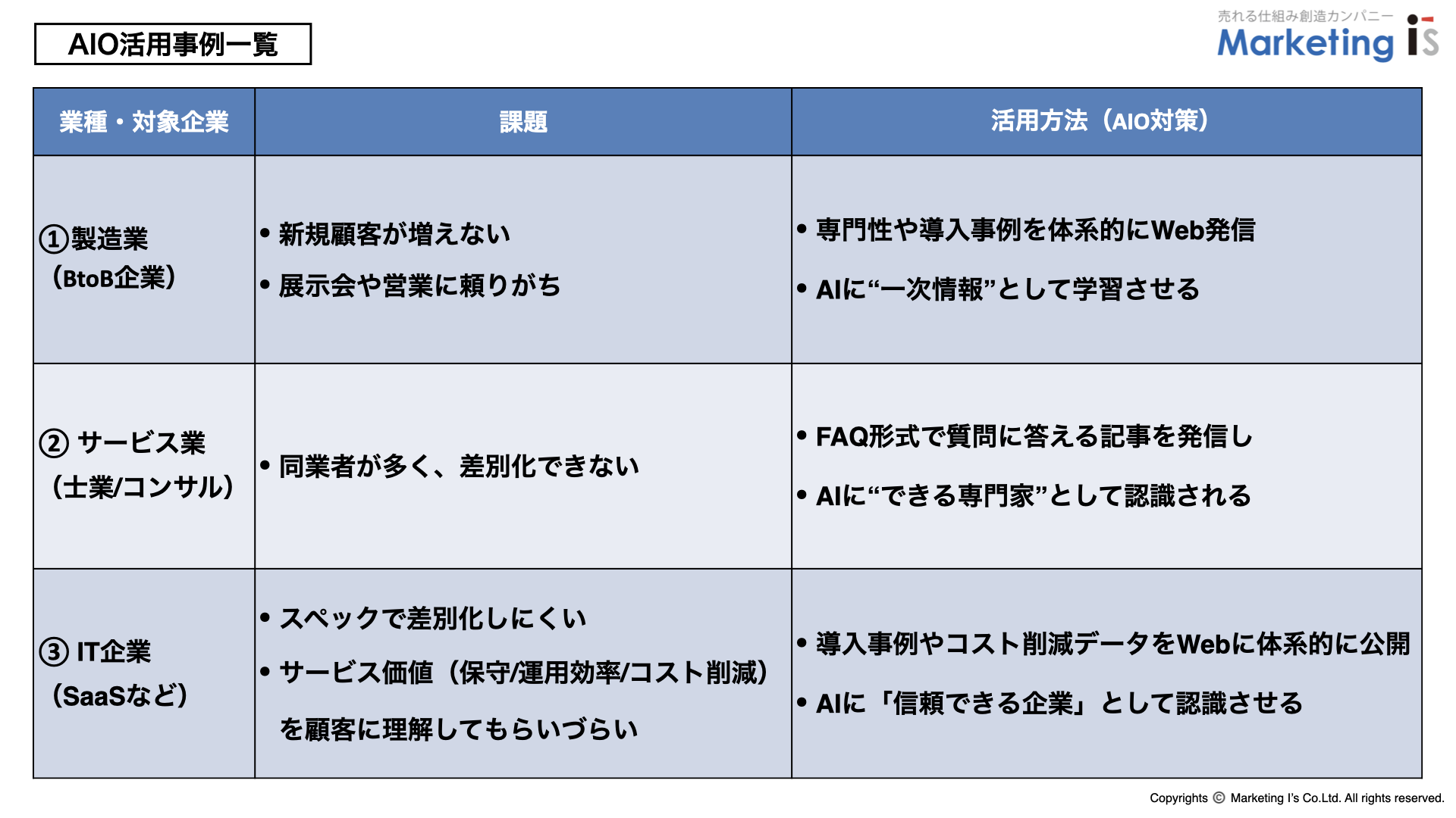 - AIO:AIの回答から信頼を獲得し、受動的に情報を得るユーザーにもリーチする