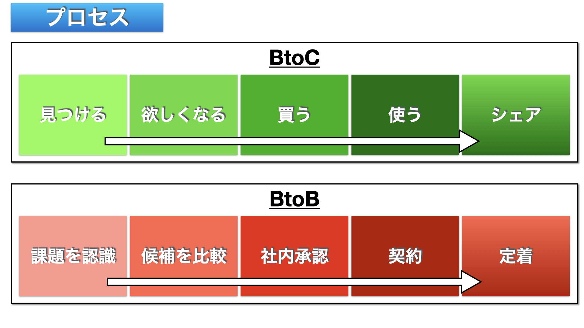 個人向けビジネス(BtoC)の場合: 見つける → 欲しくなる → 買う → 使う。短距離走のように、最初の数秒で勝負が決まります。