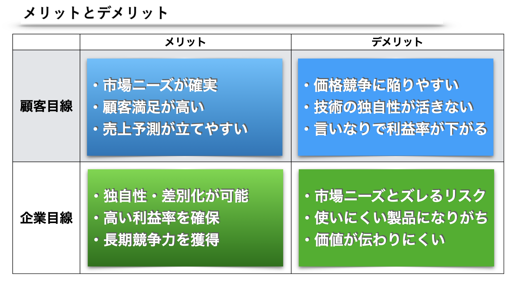 「顧客目線」と「企業目線」についての、効き目(メリット)と副作用(デメリット)を比較します。両者はどちらも正しいのですが、片方に偏るリスクが上がります。
