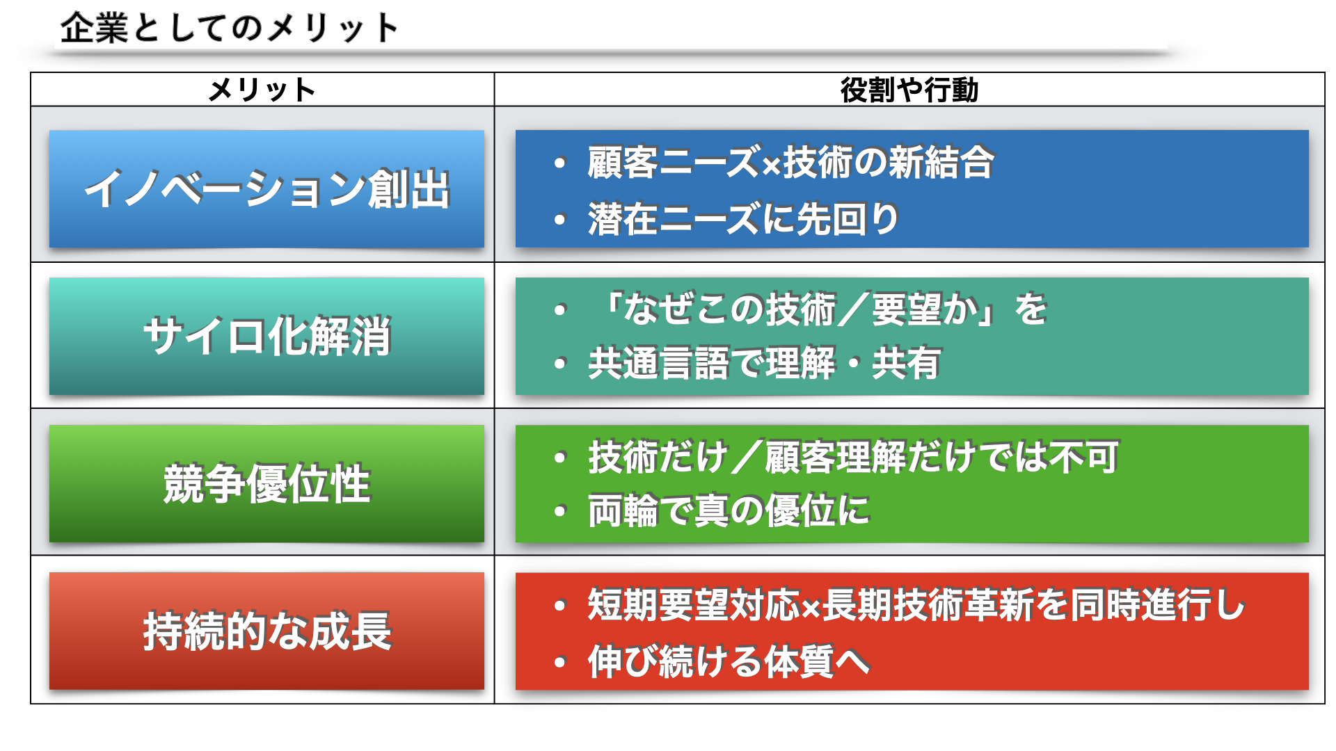 - 短期の要望対応(顧客)×長期の技術投資(企業)を両輪で動かす。