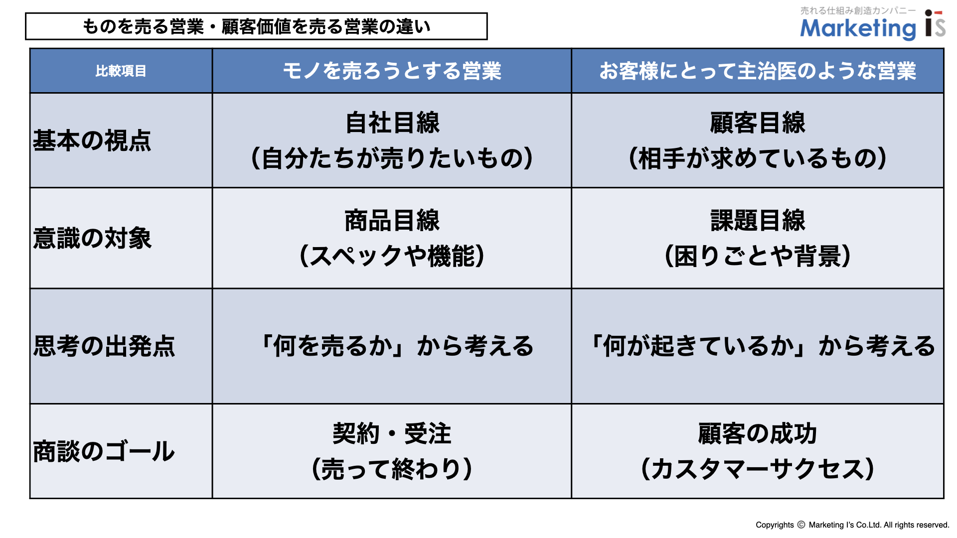 マーケティング用語で言えば、売れない営業は「プロダクトアウト(自社の商品ありき)」で動いています。一方、売れる営業は「マーケットイン(お客様の課題ありき)」で動いてから、最後に自社の商品・サービスを当てはめていきます。この発想の転換が、結果に大きな差を生み出します。